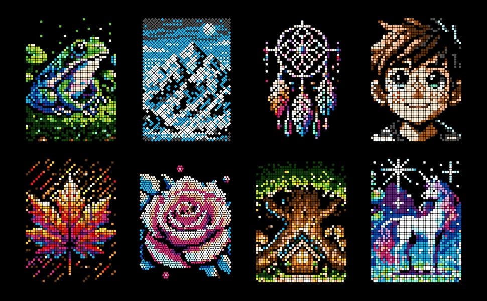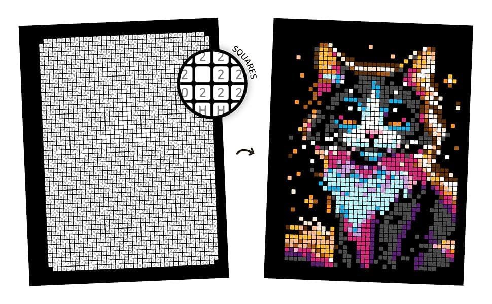 - Black backgrounds: Black backgrounds and bold grid lines make coloring easy and enjoyable.