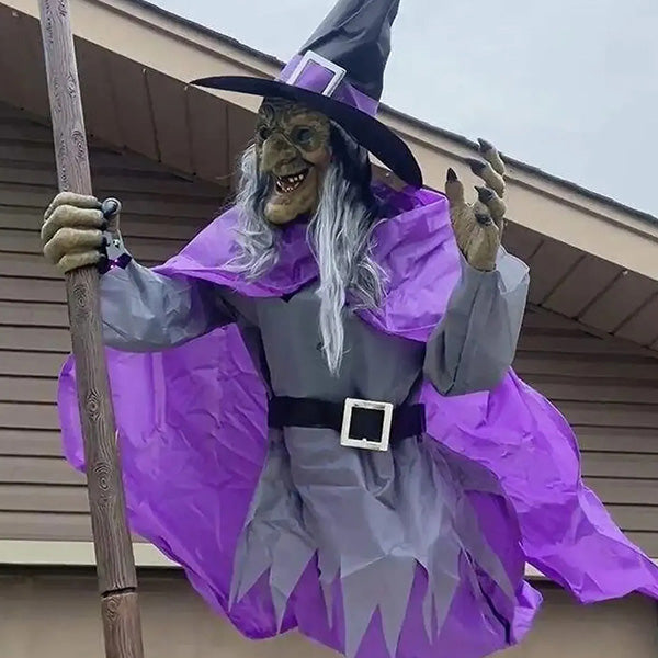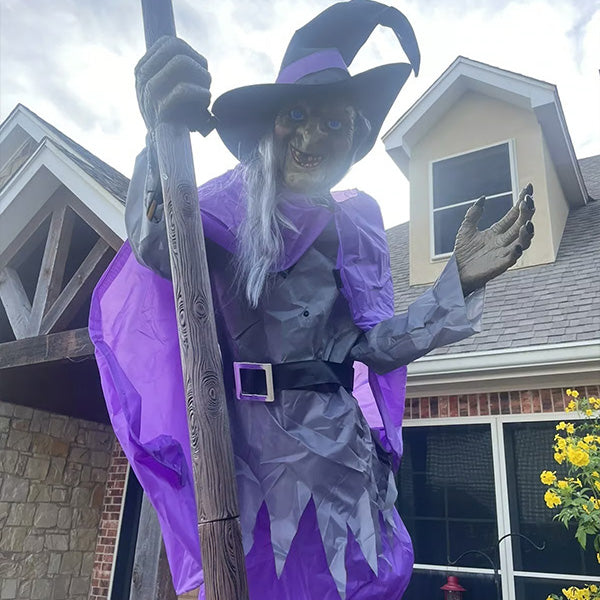 Designed for outdoor use, this foot flying witch animatronic is the perfect centerpiece for any Halloween party.