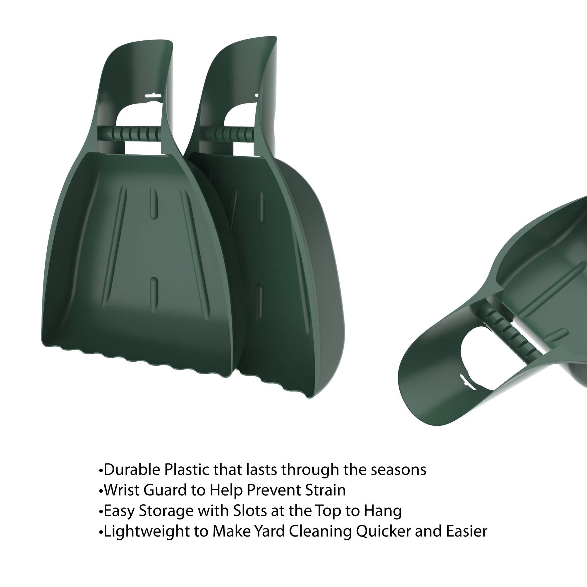 LEAF SCOOPS HAND RAKES - These lightweight leaf scoops have supporting wrist guards that allow you to collect leaves with less strain than using a traditional rake. Slots on each of the wrist guards let you hang them up for easy storage after use.