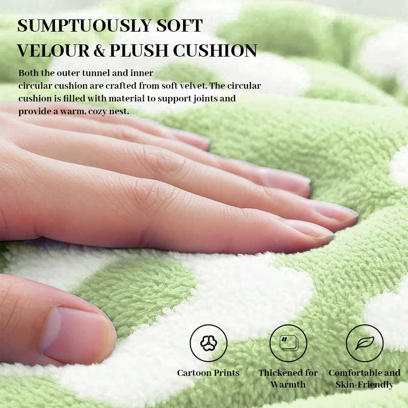- 🛋️ Sumptuously Soft Velour & Plush Cushion — The outer tunnel and inner circle cushion are made from plush velour for a luxurious, snuggly surface that cats adore. The round cushion is padded to support joints and provide a warm, calming nest.